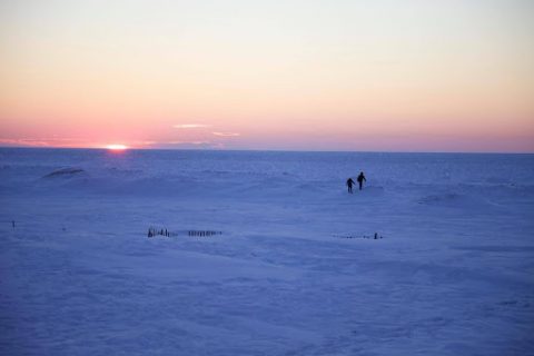 This photo was taken in February of 2014, one of the top 10 coldest winters in Michigan history. While Lake Michigan has never frozen completely over, 2014 was one of those winters when the lake did freeze to the horizon where this photo was taken. This sunset photo is at Silver Beach in St. Joseph, MI. Two teenagers (I think I can correctly surmise their age because of the folly involved in going out on a frozen lake minutes before dark) are trying to walk in the dying light over the sharp-edged ice in sub-zero temperatures, and my guess is they will have a harrowing story to tell, if they survive their adventure. I, not being a teenager, got back into my car after taking this single photo, turned on the heat to the max, and drove slowly home.
