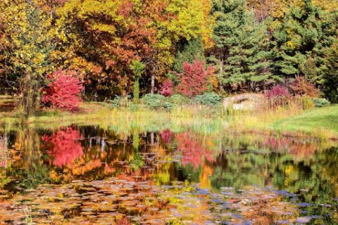 When I took the top photo I thought it was a nice Autumn scene in Michigan. But after looking at it more critically, I realized the bottom half of the photo was a more interesting Impressionistic style photo of greater beauty. Here you get the reflections of the colorful trees and scrubs, and you are more aware of the Lilly pads in the lower part of the photo. God can create beauty that surpasses that of a great artist’s brush. I have an acrylic print of the lower photo hanging in our living room when I change out the summer photos for Autumn themed ones.