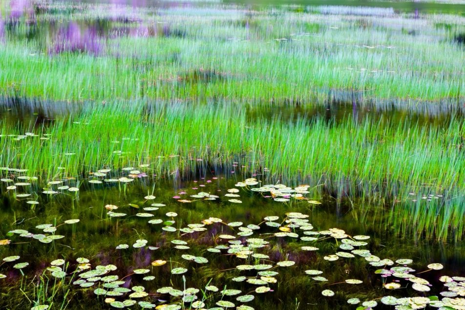 Photographer’s Trail Notes (https://photographerstrailnotes.com/the-tarn-photographers-guide) has this description of the Tarn: “The Tarn is probably one of Acadia’s more under-appreciated ponds due to its smaller stature. Many people overlook it because it’s not as well-known as some of Acadia’s larger bodies of water, such as Jordan Pond, Long Pond, and Eagle Lake. Yet, I believe it is one of its most picturesque. If you arrive at the right time, when the sun is providing picturesque reflections, you'll be rewarded with a beautiful view and likely agree with my assessment.” When you capture the light at its best, there is an almost iridescent quality to the scene. As you can see above, the Lilly pads seem to float in midair because the water is so perfectly clear. The purple Aurora Borealis like shimmering in the photo is not the result of some post production trickery—it is just natural to the scene. Totally different image in Autumn.